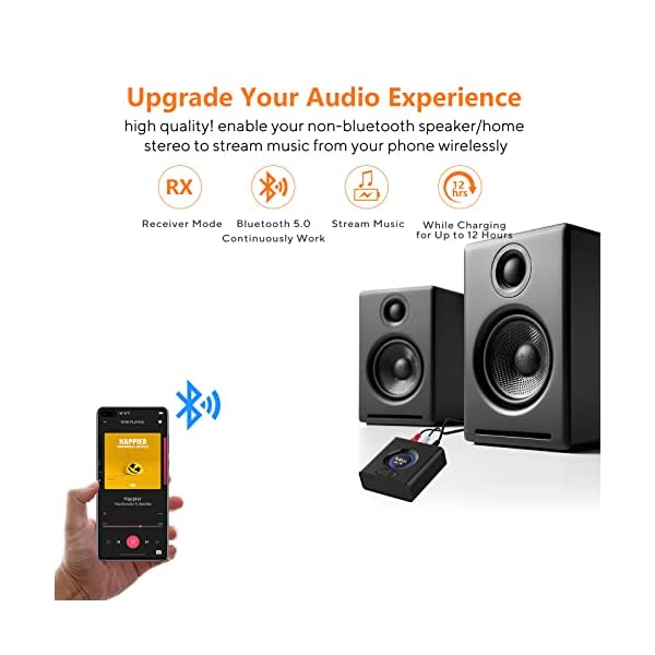 【Long Playtime & Easy to Setup】Internal battery provides up to 12 hours of using, support charging and streaming at the same time.Get fully charged within 2.5 hours;Just connect to a wired stereo and pair with a single button press to start streaming audio wirelessly.
