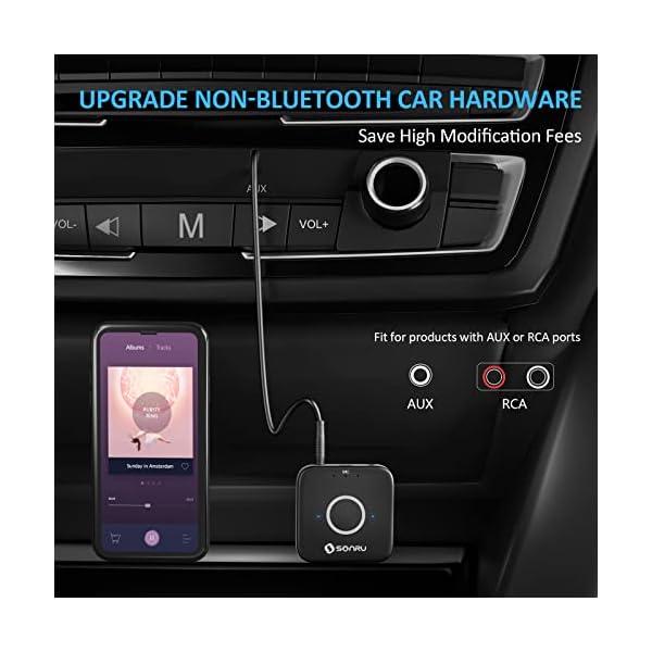 【Dual 3.5mm AUX PORTS】SONRU Newest Bluetooth 5.0 receiver has 2 AUX output ports, as well as 2 AUX 3.5mm cables plus 1 RCA cable in the package. You can connect the receiver with two different devices at the same time, such as home stereos, wired headphones, speakers, non-Bluetooth car audio systems.