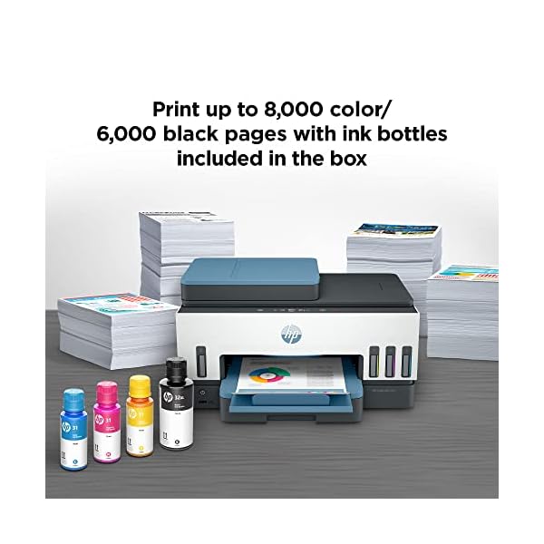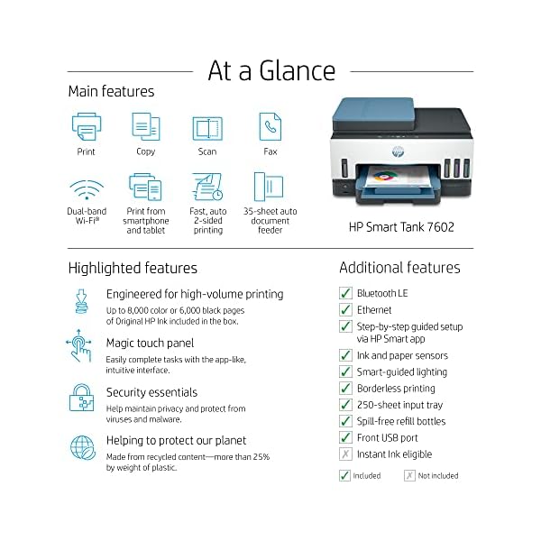The HP Smart Tank Printer 7602 make scanner printer functions seamless from start to finish with an integrated, app-like magic touch panel. The HP Smart Tank is a bluetooth printer all in one that creates outstanding quality color documents at a low cost, thanks to its automatic document feeder and wireless printer connectivity. It includes up to two years of Original HP Ink in the box. This HP all in one printer prints up to 12 ppm black and 7 ppm color with exceptional quality This multifunction printer for home office is ideal for your small business as this all-in-one color printer works as a scanner, printer, copier.