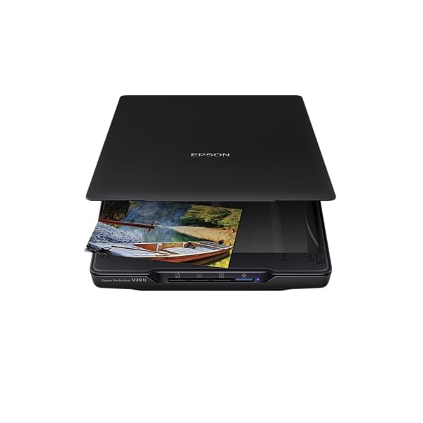 Make scanning simple with the affordable, compact and lightweight Epson Perfection® V39 II. Featuring an optical resolution of 4800 dpi1, this easy-to-use photo scanner delivers amazing clarity and detail at a great value. With the included Epson ScanSmart® software2, you can scan photos, artwork, illustrations, books, documents and more to cloud storage services3 as well as stitch together oversized images. Moreover, if your photos have faded, you can bring back the color in one click with Easy Photo Fix® technology. The V39 II delivers high-quality letter-sized scans in as fast as 10 seconds4. It also includes convenient one-touch scanning with easy-to-use buttons3, so you can scan directly to PDF or email with just the touch of a button3. In addition, you can create editable Microsoft® Word, Excel® and PowerPoint® files using optical character recognition (OCR) software3. The V39 II is USB powered for portability, includes a built-in kickstand for space-saving vertical placement and storage, and features a high-rise, removable lid to accommodate bulky items such as books and photo albums. Meet the nexus of stunning image quality and great value with the Epson Perfection V39 II.