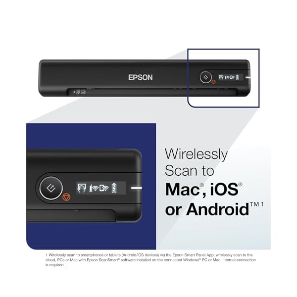 The fastest, smallest and lightest wireless mobile single-sheet-fed document scanner in its class (1). The WorkForce ES-60W is designed for professionals with busy lives and features wireless scanning and groundbreaking speeds ― scanning a single page in as fast as 4 seconds (2). Wirelessly scan documents to a PC, Mac, iOS or Android device (3). The scanner features Nuance OCR to create searchable PDFs and editable Word and Excel files, plus Epson ScanSmart Software (3) to easily scan, review and save. USB or battery-powered, the scanner automatically detects whether it’s in wireless or USB mode. No intervention is required. And, a convenient LCD displays the wireless status, as well as battery level.