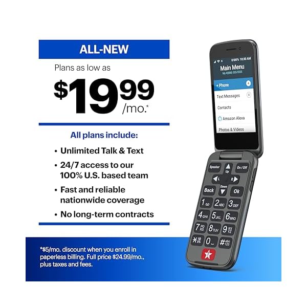 Easy-to-Use Mobile Phone: The Jitterbug Flip2 flip phone features a large screen, big buttons, powerful speaker, simple list-based menu, and Amazon Alexa for effortless navigation