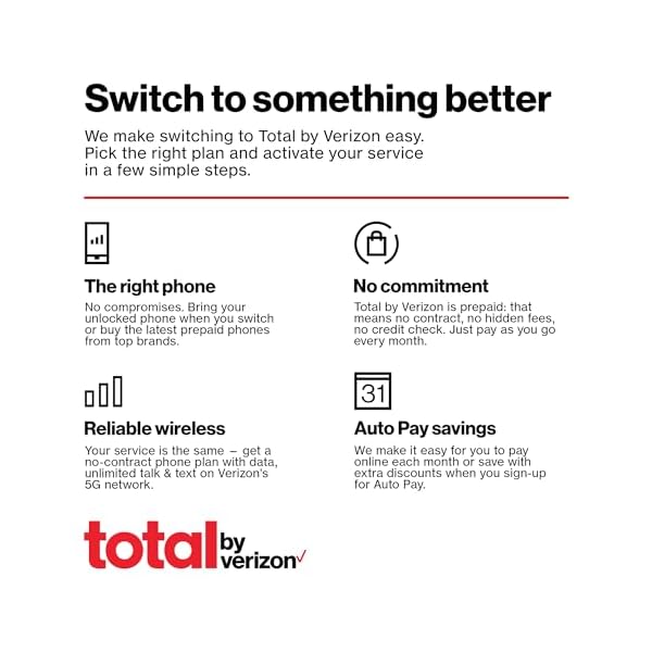 Simple and stylish, the Alcatel TCL Flip 2 from Total by Verizon provides everything you need to stay connected with family and friends. With a sleek design, the slim flip phone fits conveniently in any pocket, purse, or bag. With a high-quality camera, you can capture photos in a snap. Plus, you can keep the conversations going with up to 6.8 hours of talk time on a single charge. Get a premium wireless experience without the premium price tag or costly long-term contracts with high-speed data and Unlimited talk & text plans from Total by Verizon that start at just $30/mo for a single line. Access the fastest speeds with Verizon 5G and enjoy special perks like hotspot capability, international long-distance calling, and exclusive discounts, all on the 5G Network America relies on. 5G access requires a 5G-capable device in a 5G coverage area.