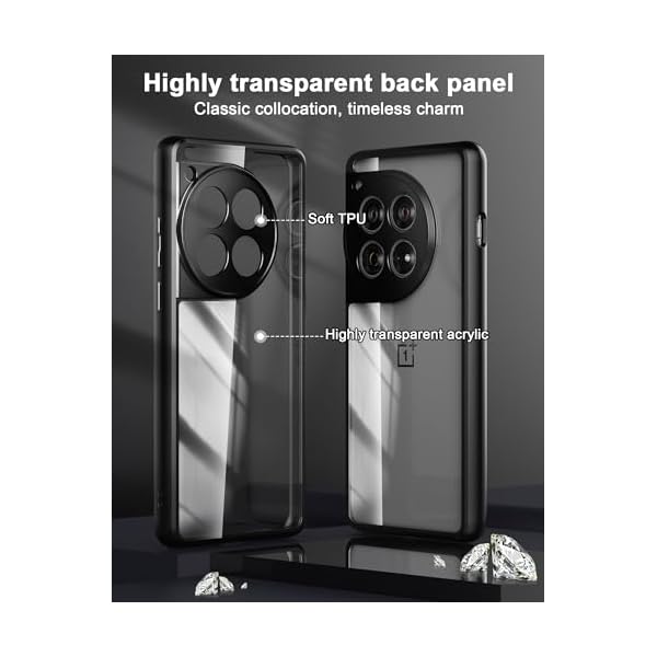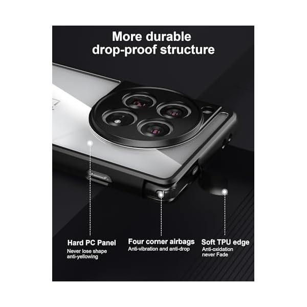 [Made with PC and TPU]: Crystal Clear case for OnePlus 12 2024 Using high-definition tpu and pc material, which effectively resist stains and sweat, not easy to get greasy and yellow over time. Lightweight and slim design. Ultra transparent and scratch-resistant back.