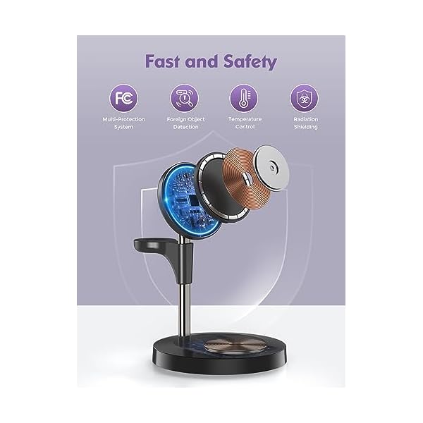 🎁 Exquisite Gift – Made of sturdy alloies, this stylish mag-safe charger stand with indicator lights is the perfect charging accessory for desktops and bedsides and a great gift for friends and family! You’ll get a 3 in 1 charging station for apple, a 3.3ft/1m charging cable, an adapter, a user guide, a 12-month warranty, and a 10 years wireless charging research and development team as your after-sales support!