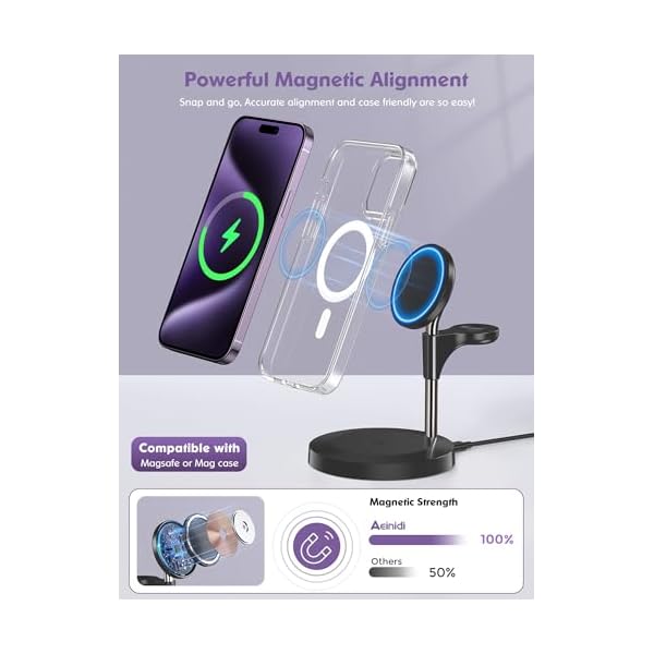 ⚡ Adjustable Viewing Angle – Allows the iphone magsafe charger to swing up to 40° up and down and the iphone to be placed horizontally or vertically, giving you the flexibility to position your iphone for the best visual experience. Aeinidi 3 in 1 charging station for apple is not only a Mag-Safe charger, but also a convenient iphone stand to keep your device within reach.