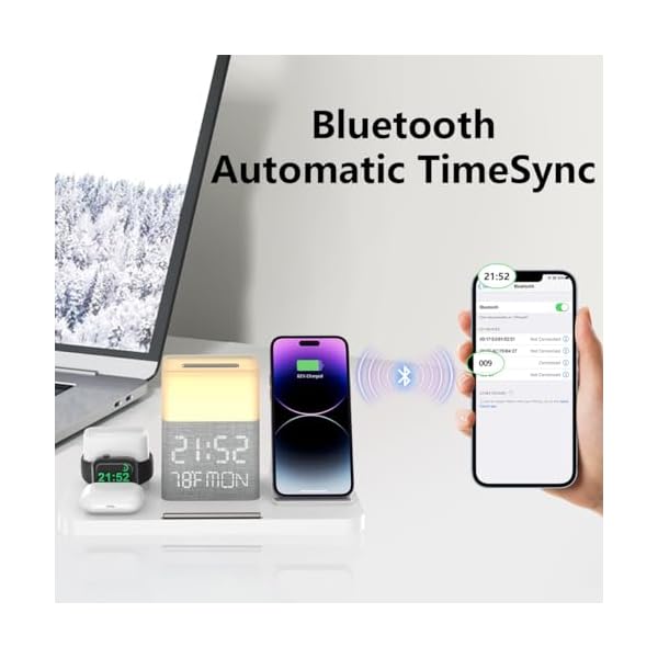 【Bluetooth Automatic Time Synchronization】-The biggest advantage of this wireless charging station is that it can automatically synchronize time through Bluetooth. The operation is very simple. Open the Bluetooth link on your mobile phone and find “009”. The connection is successful and you can synchronize.In addition to synchronizing the time, you can also see the day of the week and the indoor temperature displayed on it.