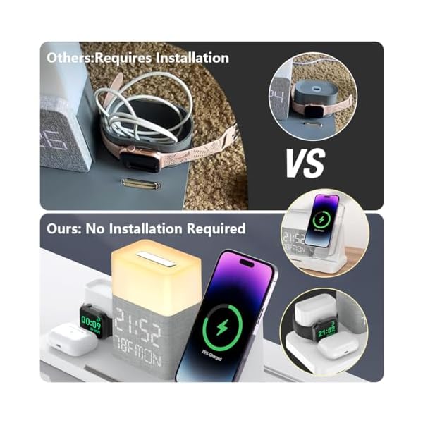 【Touch-adjustable Lighting】-The wireless charging station comes with 3 types of adjustable light: warm light, natural light and cold light. The brightness of the digital display time and temperature can also be adjusted through touch control. The adjustable brightness is 0%-100%, you can adjust it to the most Comfortable brightness, does not affect sleep.