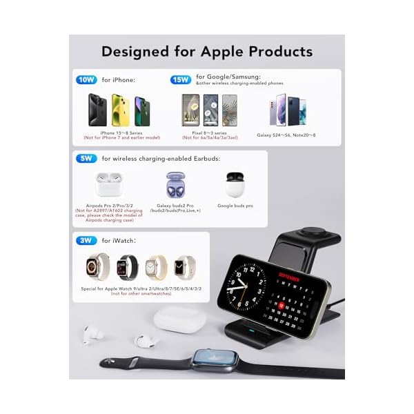【3 in 1 Wireless Charging Station】fast charging for iphone apple watch and airpods, compatible with iphone 15 Plus /15/ iphone 15 Pro Max /15 Pro/ 14 plus /14/ 14 pro max /14 pro/ 13 Pro Max /13 Pro/13/13mini/12/12 mini/ 12 Pro/12 Pro Max/ 11 pro Max /pro/SE 2/XR/X/XS/XS Max/11/8 plus/8, Apple Watch Ultra (2) / 9 / 8 / 7 / 6 / 5 / 4/3/2/SE, Airpods pro 2 /pro/3/ 2, and other wireless charging-enabled phones buds such as samsung google products.