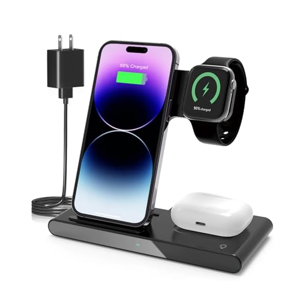 3 in 1 wireless charger iphone: A charging station for apple devices charging your Airpods, iPhone, and Apple Watch simultaneously. Compatible with iPhone 15 14 13 12 11 8 Pro Max Mini Plus X XR XS Max SE Plus, Apple Watch Series 9 8 7 6 5 4 3 2 SE, AirPods 2 3 pro pro 2 (Note: for Airpods 2 3, needs work with a wireless charging case ). It can also charge other phones with wireless charging capabilities