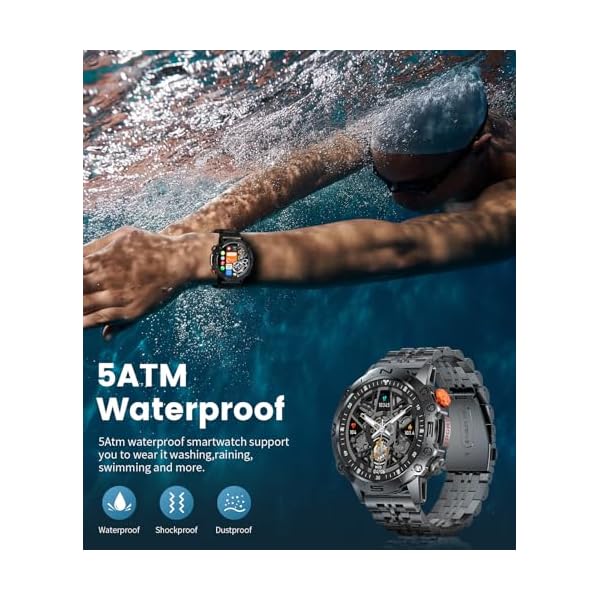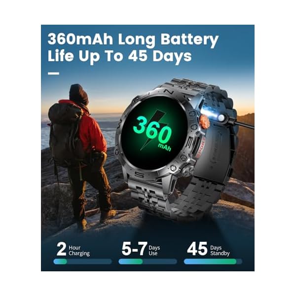 🎖【Military Grade Standard&IP68 Waterproof】This rugged military smart watch boasts 12 outstanding certifications: shock resistance, extreme temperatures, IP68 waterproof, dust-proof etc. The solid steel bracelet and folding safety buckle are made of 304 stainless steel and its unique metal case and composite construction ensures durability. This tactical smart watch for men were created especially for outdoor enthusiasts and are waterproof, shockproof, and dustproof.