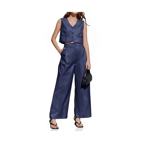 Cicy Bell Womens 2 Piece Striped Outfits Sleeveless V Neck Blazer Vest and Loose Wide Leg Pants Suit