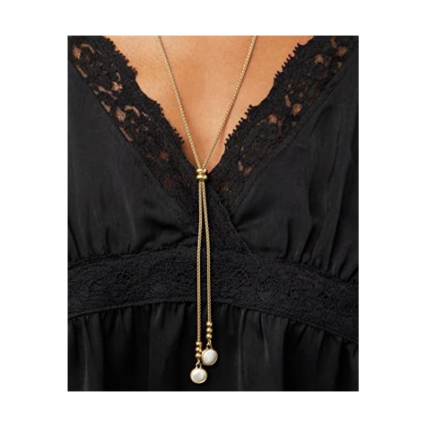 Imitation mother-of-pearl stones dangle beautifully from this long lariat necklace by Lucky Brand. Fashioned in silver-tone mixed metal. Approximate length: 30-1/2″ + 2″ extender. Approximate drop: 1-1/2″.