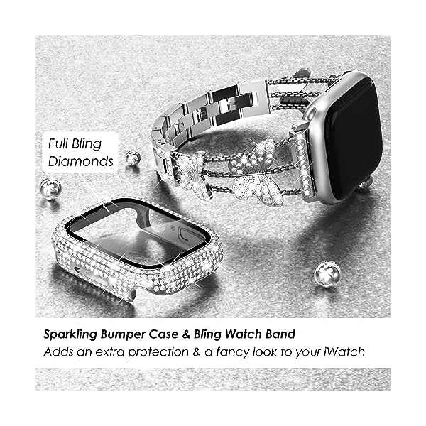 💎【Unique Bling Bracelet with Diamond Case】Elevate your style with our shiny Apple Watch bands 44mm for women with sparkling Apple Watch Screen Protector Case. Featuring a luxurious metal band complemented by stunning rhinestone accents, a perfect fashion piece to turn your apple watch into a stylish accessory. The butterfly, a symbol of freedom, beauty, elegance and class. The romantic butterfly releases ideals, unleashes blessings and reaps compliments.