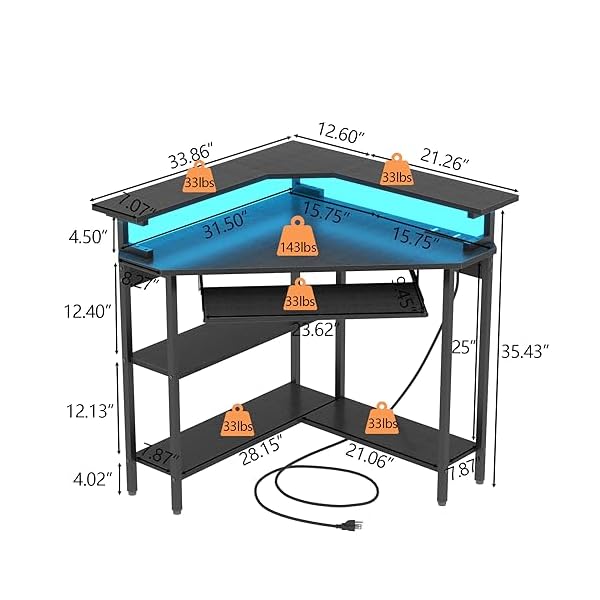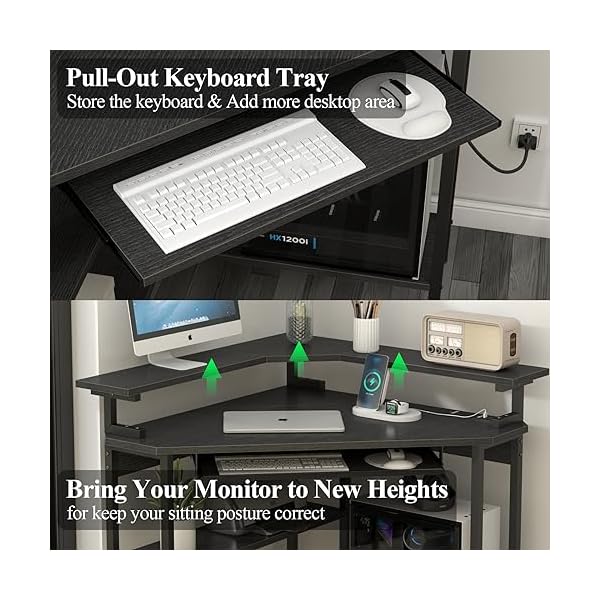 【Space-Saving Design & Ample Storage Space】This corner desk combines a triangular design with ample storage space to effectively utilize corner space, creating a fully functional workstation to optimize your room layout and making it an ideal choice for small spaces. It’s equipped with a spacious desktop, a dedicated monitor stand, a convenient keyboard tray, and three-tier storage shelves at the bottom. It provides ample area for your storage needs and keeps your workspace tidy and efficient.