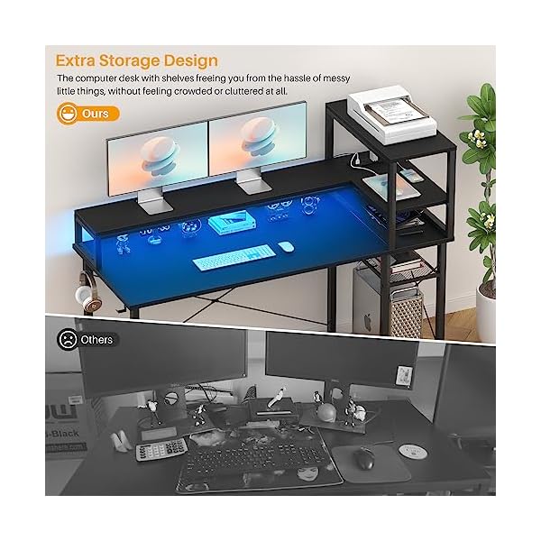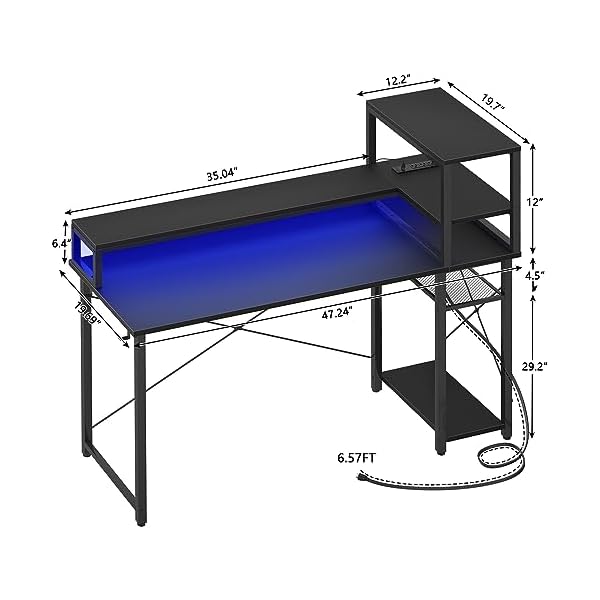 Cyclysio Gaming Desk 47″, Computer Desk with Reversible Storage Shelves, Home Office Desk with Power Outlets & RGB Led Lights, Small Desk for Gaming, Studying, Working, Black