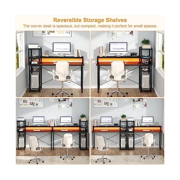 【Storage Shelves & RGB Light】Desk with 5-tier open shelf can store books, calendars, plants, printers and other office supplies etc. It is very convenient to access and keeps your desktop organized. The bottom of the monitor stand has an RGB light strip with 20 light modes and the lights can change with the frequency of the music to provide you with an amazingly entertaining atmosphere.