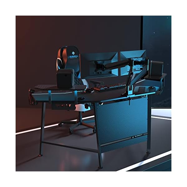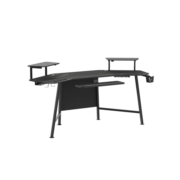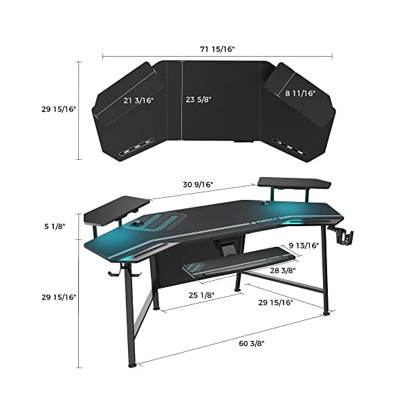 Large Desk Surface: Wing-shaped Gaming desk measures 72″ wide by 24″ deep, supports up to 400 LBS. Ergonomic Desktop provides flexible room for your abdomen and arms, designed for the people who sit for a long time. Large gaming desktop with smooth carbon fiber texture easily hold gaming gears, music studio or live streaming devices.