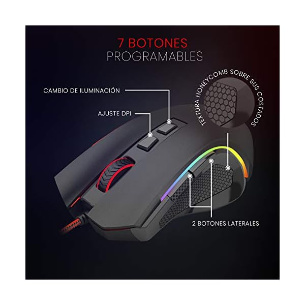 HIGH-END PC GAMING MOUSE FEATURES; The Redragon M602-RGB Mouse features; Built-in Weight Tuning for the right balance, Anti-Skid Scroll Wheel, Durable smooth TEFLON feet pads for ultimate gaming control. 7 programmable buttons. Total 8 buttons. The Mouse works great with Redragon Gaming Mousepads & Keyboards. Comes with 6 foot, 3mm strong high-speed braided fiber cable and a gold-plated corrosion free USB connector for a reliable connection
