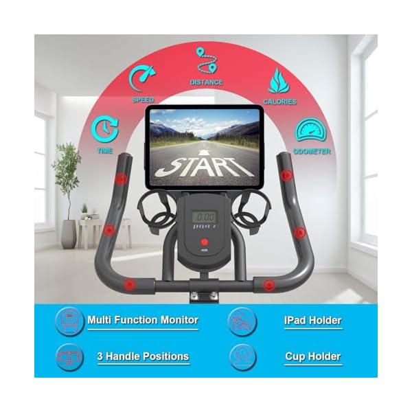 🚴【EXERCISE BIKE FOR HOME 】Heavy-duty steel frame of the exercise bike guarantee the stability while cycling.It supports up to 300 lbs max weight.Infinite resistance system and Belt Drive System can ensure that you are in a stable state during exercise.Provide you with a smooth and silent riding experience.Suitable for all fitness levels.