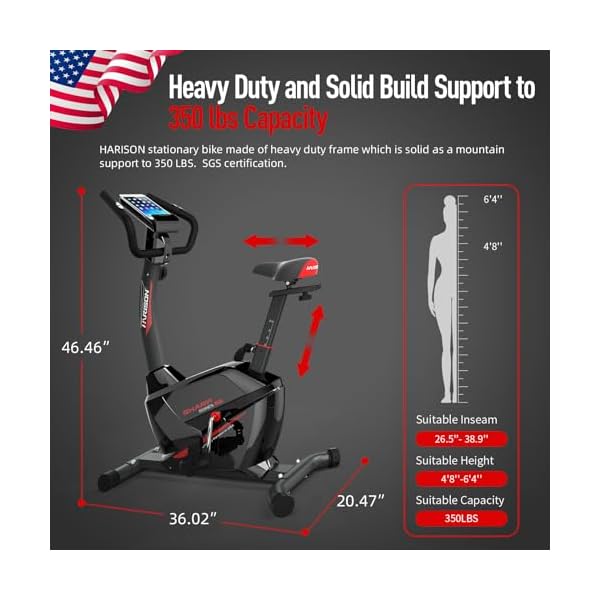 HIGH QUALITY & SOLID BUILD : HARISON stationary bike made of heavy duty frame which is solid as a mountain support to 350 LBS. The stable structure, US mute system creates an unbelievably smooth and nearly silent ride, SGS certification, safety assurance.