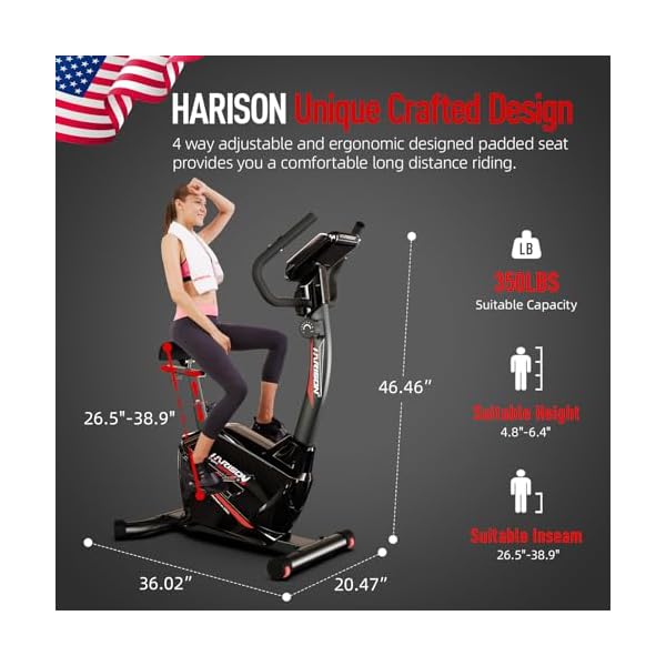 HARISON MISSION: Provide our customers with the best product and customer service. The measurement and capacity is the actual result. Exercise with quality, Enjoy fitness with Family. HARISON B6 exercise bike with a suitable inseam of 26.5”- 38.9”, a suitable height of 4’8”-6’4, a weight capacity of 350 lbs.