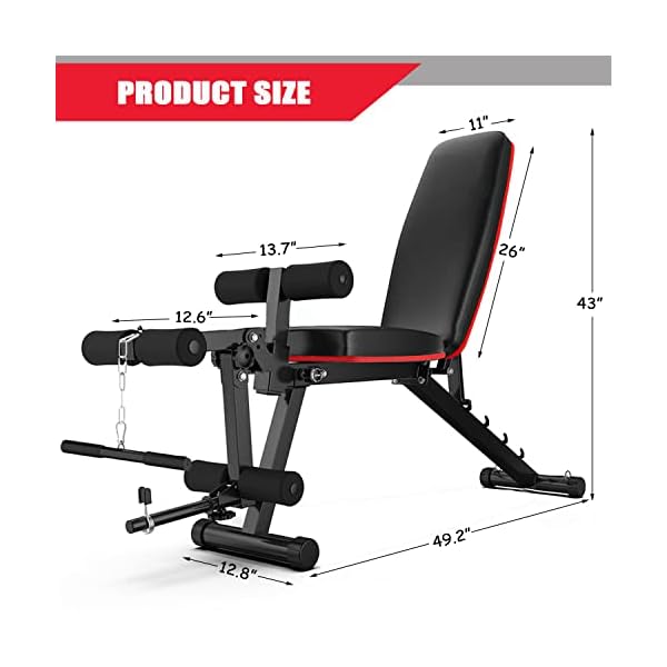 🥇 【Full Body Fitness】The weight bench features a secure sawtooth back pad adjustment design that can be modified to an incline, flat, or decline position, allowing you to do a variety of exercises, such as sit-ups, push-ups, leg curl and extension, dumbbells, hamstring curls, bench press, pull rope and so on