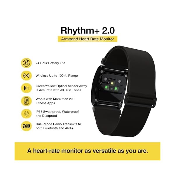 EXTREME DURABILITY: Rhythm+2.0 is tough and waterproof with an IP68 rating, perfect for intense workouts. Swim, run, or train outdoors without compromising its performance. Ideal for fitness enthusiasts and outdoor enthusiasts.