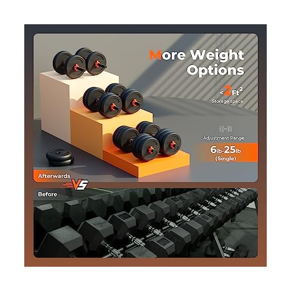 【More Weight Options】The dumbbell pieces feature a detachable design, and the adjustable weight range for the single dumbbell is 6lbs-25lbs, which meets your exercise intensity needs in different stages. Installation is easy.