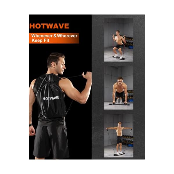 【PORTABLE HOME GYM】HOTWAVE Professional Exercise Pack is used with various workout equipment attachments:foldable Pushup board,3-section Bar,4 Resistance Bands, 2Ankle Strap,door nachor,which can fulfill most of your workout needs in the gym.The combination can complete more than 30 exercise modes.