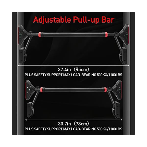 đȘăFully Adjustment Pull Up BarăThe pull-up bar can fit in most door frame between30.7″- 37.4″ adjusted by the Hex Wrench.t can be installed in any cement walls, security doors, solid wood doors, corridors but not including fragile door frames,Suitable for standard doorway, perfect for home, garage or office use.