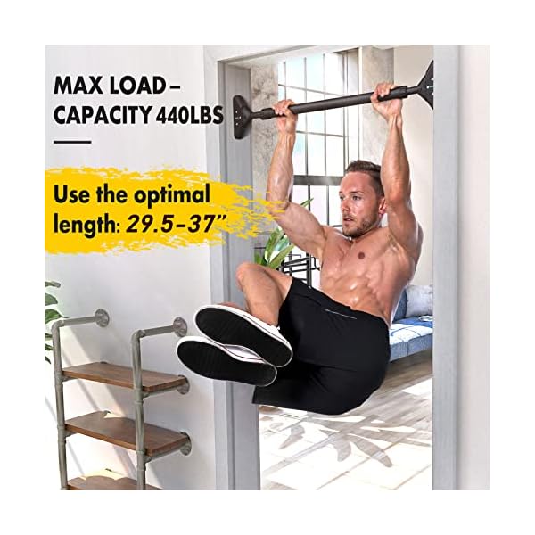 Industrial Grade Material – This chin up bar made of 5mm thickness 30mm diameter steel pipe with sturdy industrial. When you use the shortest distance 74.9cm/29.5in, solid support with 200kg/ 440lbs loading bearing. When you use the longest distance 94cm/37in, the bar load capacity is 75kg/165lbs.