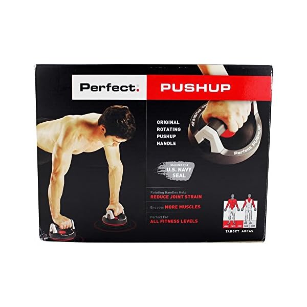 The Perfect Fitness Perfect Pushup Rotating Push Up Handles reduce strain on joints, and engage more muscles for a truly perfect pushup. The original, patented design features a ball bearing system that provides smooth, full rotation for natural alignment of the arms and wrists. Comfortable rubber grips and non-slip base ensure stability during high rep, multiple set upper body workouts. Invented by a US Navy SEAL to optimize the basic push up, the Perfect Fitness Perfect Pushup reduces pressure on the hands and wrists, and effectively activates muscles through its ergonomic design, increasing strength and definition in arms, shoulders, chest, back, and core. Appropriate for all fitness levels, from beginner to expert. Includes two rotating handles.