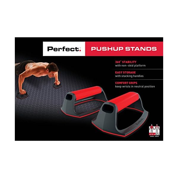 Engage more muscles to maximize results with the Perfect Pushup Stands. Padded comfort grips keep wrist in neutral positions to reduce joint strain. Increases muscle strength and definition in arms, shoulders, chest, back and abs. 360 Degree stability with non-skid platform grips well on carpet and all hard floor surfaces. Easy storage with stacking handles.