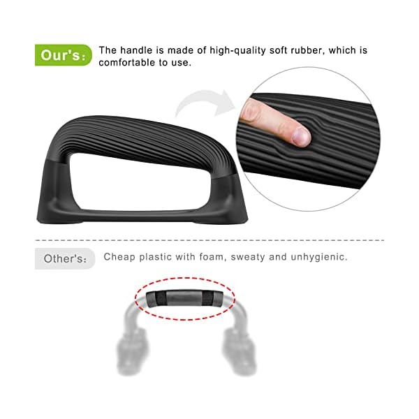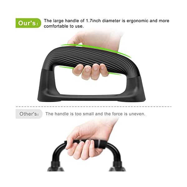 šćComfortable and Secure GripćOur push up bars feature thickened soft plastic handles that provide a comfortable and ergonomic grip. The handle has a textured surface that prevents slipping and enhances stability. The handle is also angled to allow a natural range of motion and prevent injury.