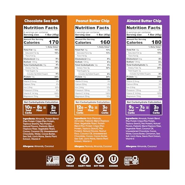 Keto Friendly Snacks w/ Only 3g Net Carbs in Every Serving – Net carbs are carbs that are absorbed by the body, and our keto treats come with only 3g of net carbs in every serving. Each keto plant based protein bar is packed with 11-13g of total carbs, 8-10g of fiber, 12-14g of fats & 180 calories