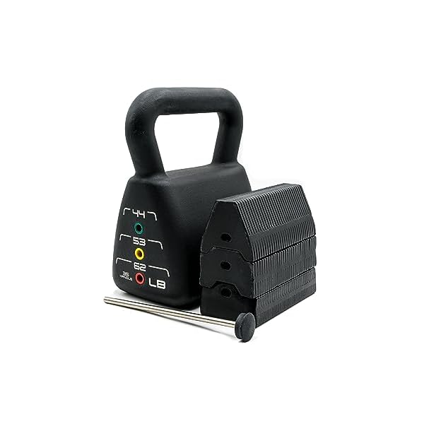 KETTLEBELLS ADJUSTABLE WEIGHT: Utilize this PowerBlock kettlebell set that feels like solid iron with the advantages of adjustability. This kettlebell has a range of 35-62 pounds and easy weight identification for a great workout.