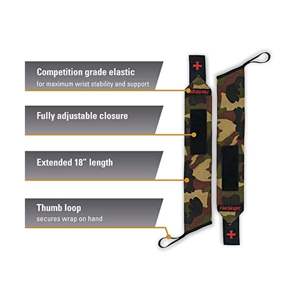 Extended 18-inch length offers strong support to the wrists, and thumb loop secures the wrist wrap to the hand
