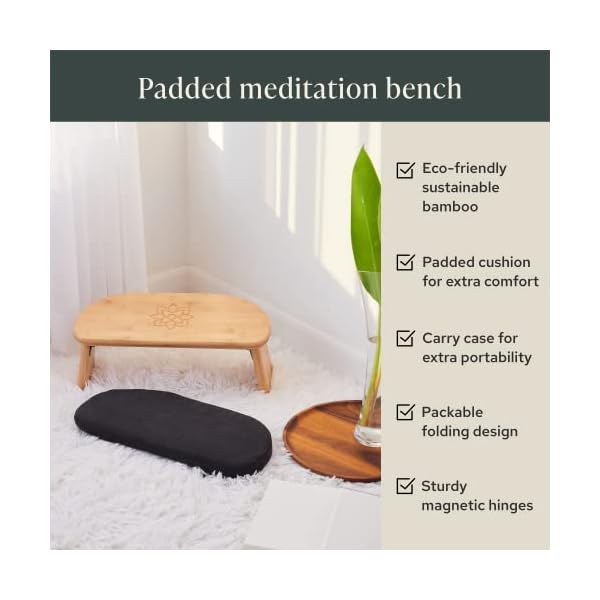SECURE, LOCKING MAGNETIC HINGES – Like our best selling meditation bench, this cushioned stool features locking magnetic hinges. Additionally, the angled seat position allows your body to effortlessly straighten, which removes all strain from your lower back and knees. You can comfortably meditate without fear of your bench shifting or collapsing under you!