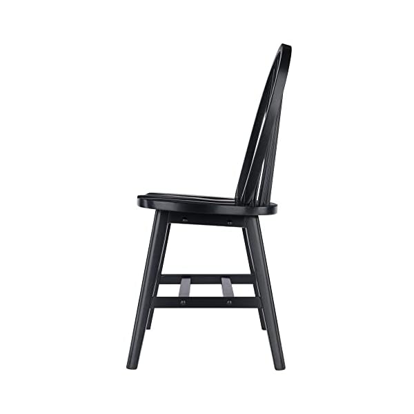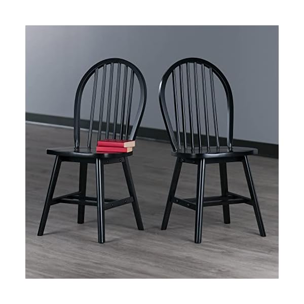 As early as the 16th century, English woodworkers began fashioning chair spindles in the same way they made wheel spokes, a design that became known as the Windsor Chair. This Winsome 2-piece set echoes that tradition. The 6-spindle arched back and the wide contoured seat offer the kind of support you want when lingering over dinner. The chairs are made of solid wood in a crisp black finish that will enliven your kitchen or dining area from contemporary to transitional decor. A double set of crossbars add durability and stability. Static weight capacity is 220 lbs. Conveniently ships in 1 box with all the hardware needed for assembly. Overall dimensions: 17.9″W x 20.5″D x 36.7″H Seat dimensions: 17.3″W x 12.6-15.6″D Seat height: 17.8″H Height of backrest: 19.7″H Static weight limit: 220 lbs. Assembly required Ships in 1 box