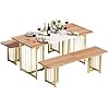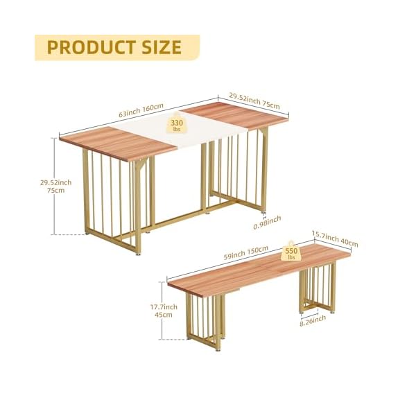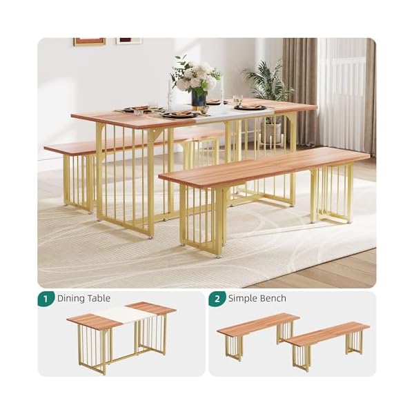 Unique Modern Design: The tabletop of the dining table set for 6 features a patchwork design in walnut and white, enhancing the decor of your home. The table’s gold hollow bases on both sides, along with the bench and chairs’ unique T-shaped gold bases, not only adhere to modern aesthetic designs but also ensure good stability.