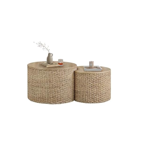 【2-Piece More storage】This new round coffee table set with storage is a larger and upgraded version of the original, which consists of a rattan coffee table (Φ26″ x H15″) and a side table (Φ21.65″ x H13.2″). What’s more, we added a cover to the rattan end table, and underneath the cover is a wide storage space for snacks, tissues, toys, and various other items to make your home cleaner and tidier!