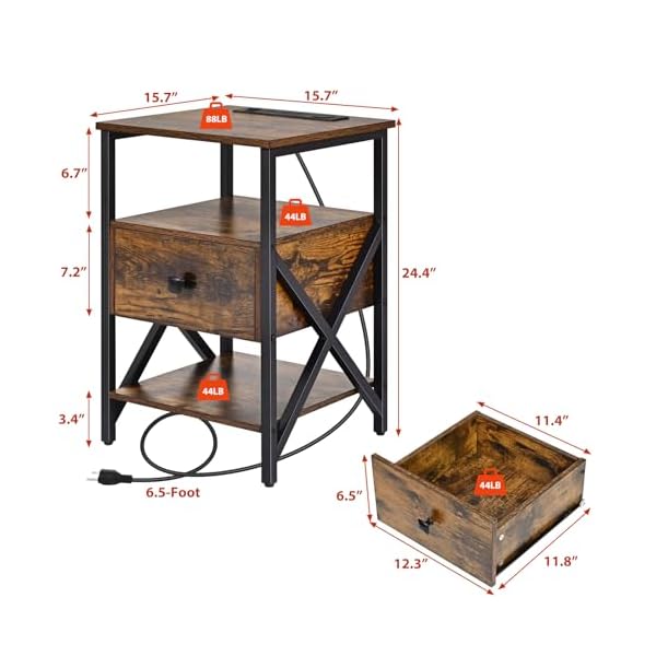 Stylish & Durable: The drawer can be installed in two ways, you can decide to mount on the second level or the third level, it’s up to your needs. With high-quality particleboard and sturdy metal frames, this side table with fast charging is durable.