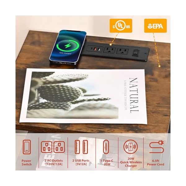 Wireless Charging Station: This end table designs with 2 AC outlets, 2 USB-A, 1 Type-C, 1 wireless charger and 1 power switch, allowing 6 devices to be charged simultaneously. The power switch enables you to control power supply by pressing switch instead of unplugging the 6.5ft power cord.