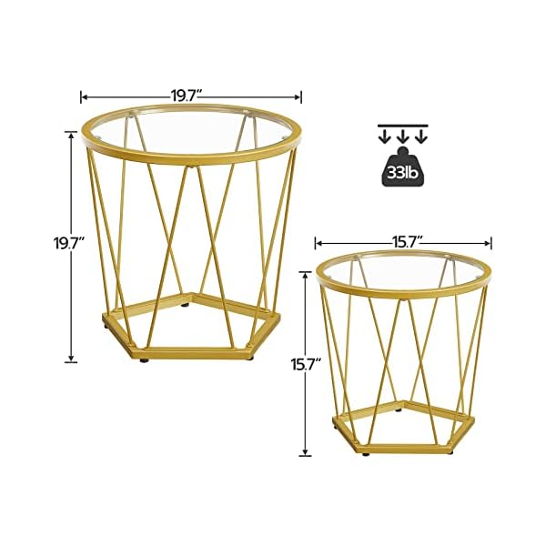 Solid Construction and Strong Load Ability: The carefully selected materials combining the solid metal frame and high-quality tempered glass cast a firmly constructed gold coffee table with strong load ability. The maximum static load of each side table is 33 lb, which greatly increases the utility of this end table set