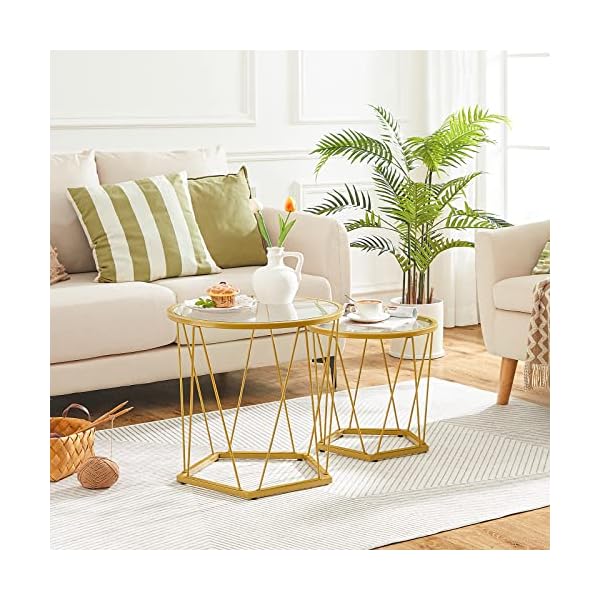 Full of Artistic Beauty: Each coffee table integrates various fashion elements including glass round tabletop, polygonal base, and gold metal frame, full of modern sense, elegance and refinement, improving your home style and taste greatly