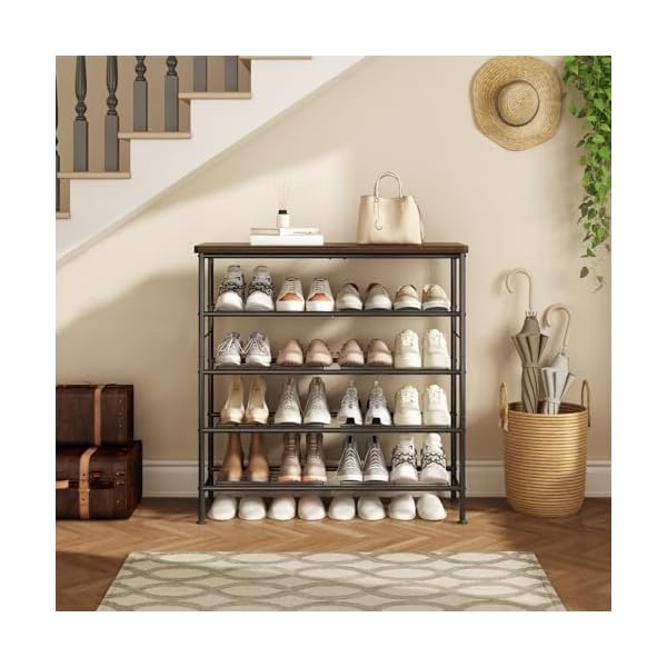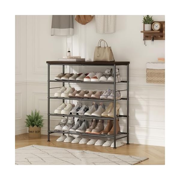 RELIABLE SUPPORT: The 5 tier shoe rack can hold 16-20 pairs of shoes,the top wooden board can hold up to 22 pounds and each rack can hold up to 11 pounds.