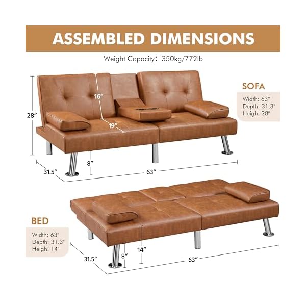 【Built For Comfort & Durability】Supported by Chrome-plated steel legs and an engineered wood frame, this convertible futon bed boasts a high capacity of up to 772 lb. Resilient foam cushions are upholstered in skin-friendly faux leather, offering extra comfort and easy cleaning.
