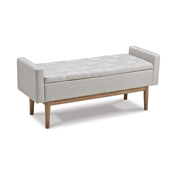 Contemporary style gets practical with this bench. The tufted beige seat cushion is hinged to allow easy access to whatever you need to hide in plain sight. The raised edges give the impression of arms on this cushioned seat while the light brown finished wood legs help it blend with many different modern styles. And we go the extra mile to package, protect and deliver your purchase in a timely manner. The trusted source for stylish furniture, lighting, rugs, accessories and mattresses for every taste and budget, our wide assortment brings your space to life with furniture and decor that show off your style personality.