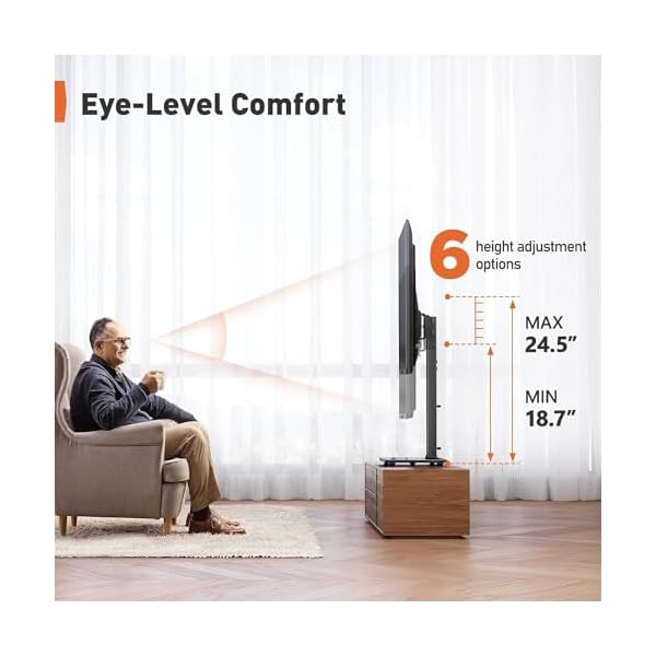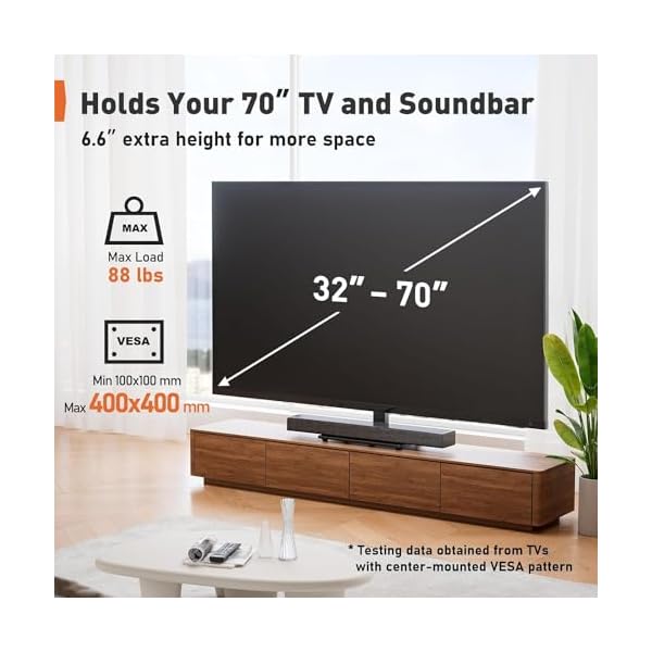 【6 Levels of Height Adjustment】The TV table stand offers 6 height configurations with 2 installation positions on the column and 3 height choices on the brackets. Holds up to 70″ TVs and soundbars with a screen center height of 24.6″, this will give you more space to place your cable box, DVD player, sound bar.
